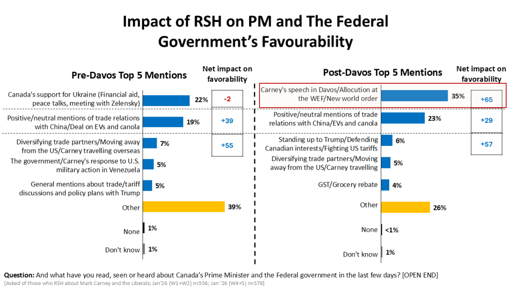 - Net Carney favourability (pre-Davos +14 vs. post-Davos +21).