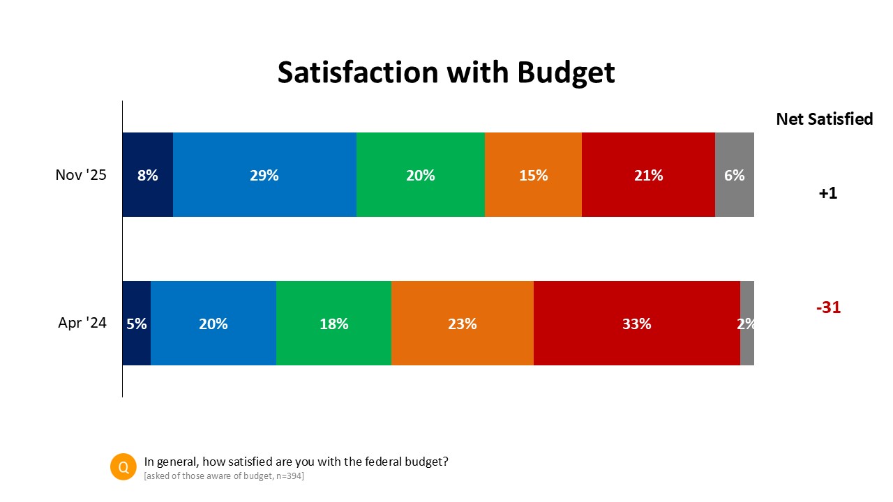 What a difference a year makes. The Trudeau government’s last budget in September 2024 was very poorly received, with 25% of Canadians reporting themselves satisfied with it after its delivery, compared to 56% dissatisfied. As a result, a near-majority (49%) of Canadians were calling for an election in its aftermath.