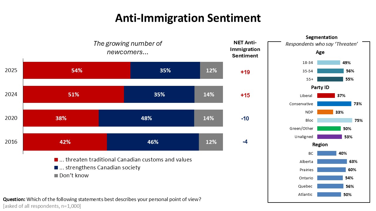 The data reveals a 16-point increase over the past 5 years in hostile views of immigrants. A clear majority (54%) now believe that immigration threatens traditional Canadian customs and values, up from just 38% in 2020, with a small 4-point NET score increase occurring in the past year (from +15 to +19). This isn’t a blip, but a trend with momentum.