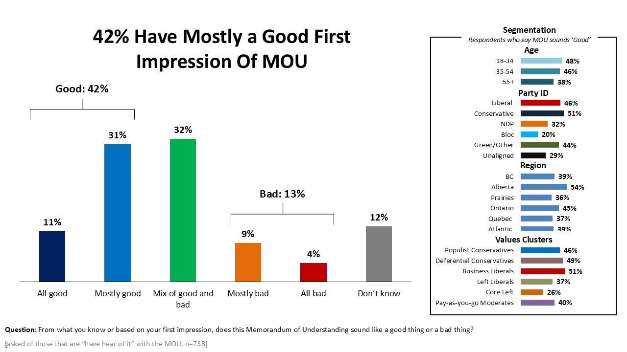 While this agreement has been front and centre in the political class and with the energy sector, it has generated low awareness among average Canadians. As noted, only 27% are familiar with the announced MOU, although another 32% have heard about it but don’t know the details. That means initial reactions should be fluid and open to change.