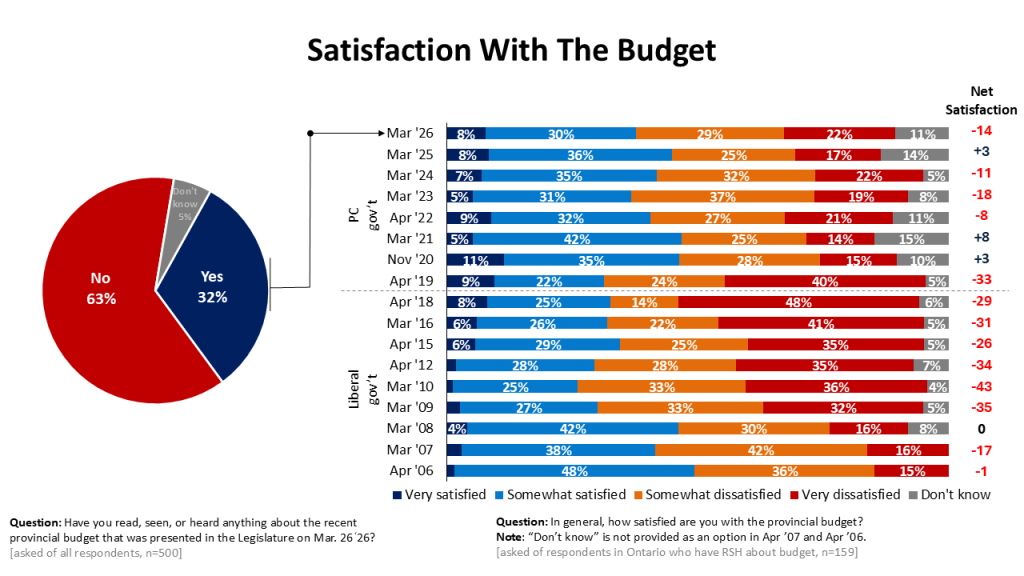 The Ontario PC Budget released on March 26th was hardly noticed by Ontarians, with only about one-third of Ontarians reporting having read, seen, or heard anything about it. This is a 7-point increase compared to the 2025 budget, but a far cry from the widespread interest of Premier Ford’s first budget in 2019, when 61% of Ontarians had read, seen, or heard something about it.