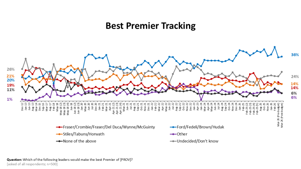 The Premier’s numbers are split. A narrow plurality (40%) of Ontarians see Doug Ford unfavourably, and 1-in-4 very unfavourably, versus 38% favourable. We also see an uptick in those who are unaligned and neutral in their party identification or have a negative impression of Doug Ford, to 20%. A plurality of Ontarians (36%) still rate Ford as the best choice for Premier. However, the number of undecided voters has risen to 24% (up 4 points post-budget), which is a potentially complicating factor.