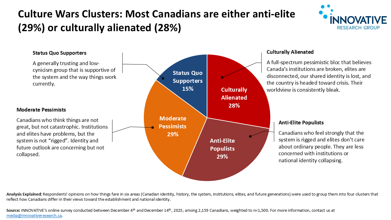 - Culturally Alienated (28%): Canadians who believe institutions are broken, elites are disconnected, our shared identity is lost, and the country is headed toward crisis.