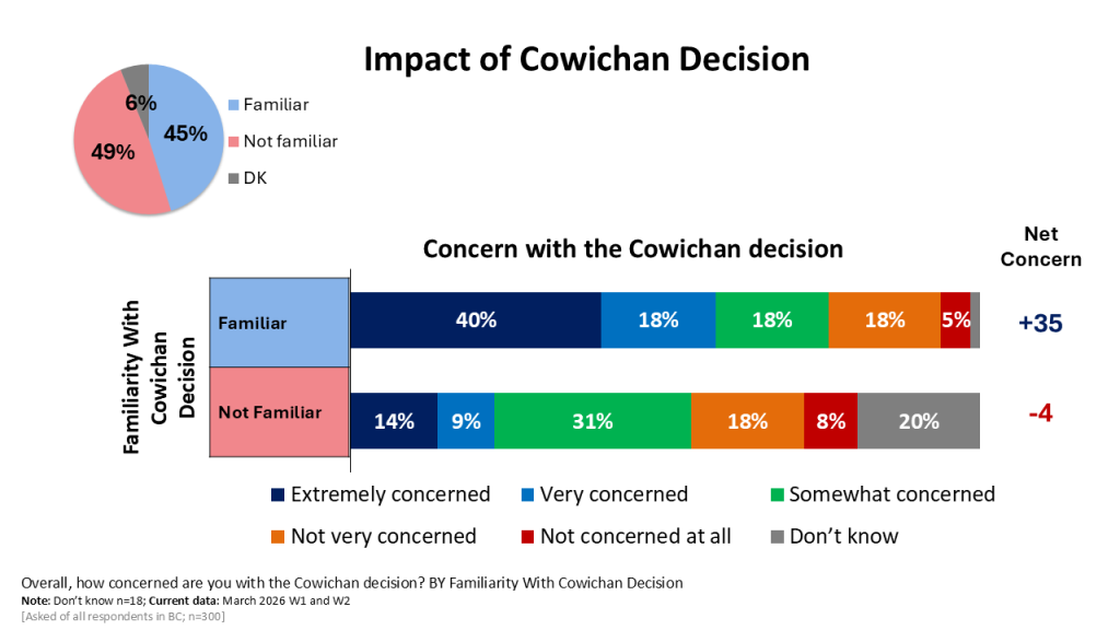 Looking at the Cowichan decision, only 45% of British Columbians are familiar with it. But net concern among the familiar is +35 versus -4 among those not familiar.