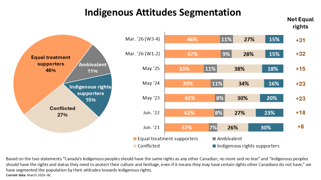 Nearly half of British Columbians (46%) are now ‘Equal Treatment’ supporters, up 13 points from 33% in 2025, while the ‘Conflicted’ segment has shrunk from 38% to 27%. Even among NDP voters, a plurality of 39% are now equal-treatment supporters.
