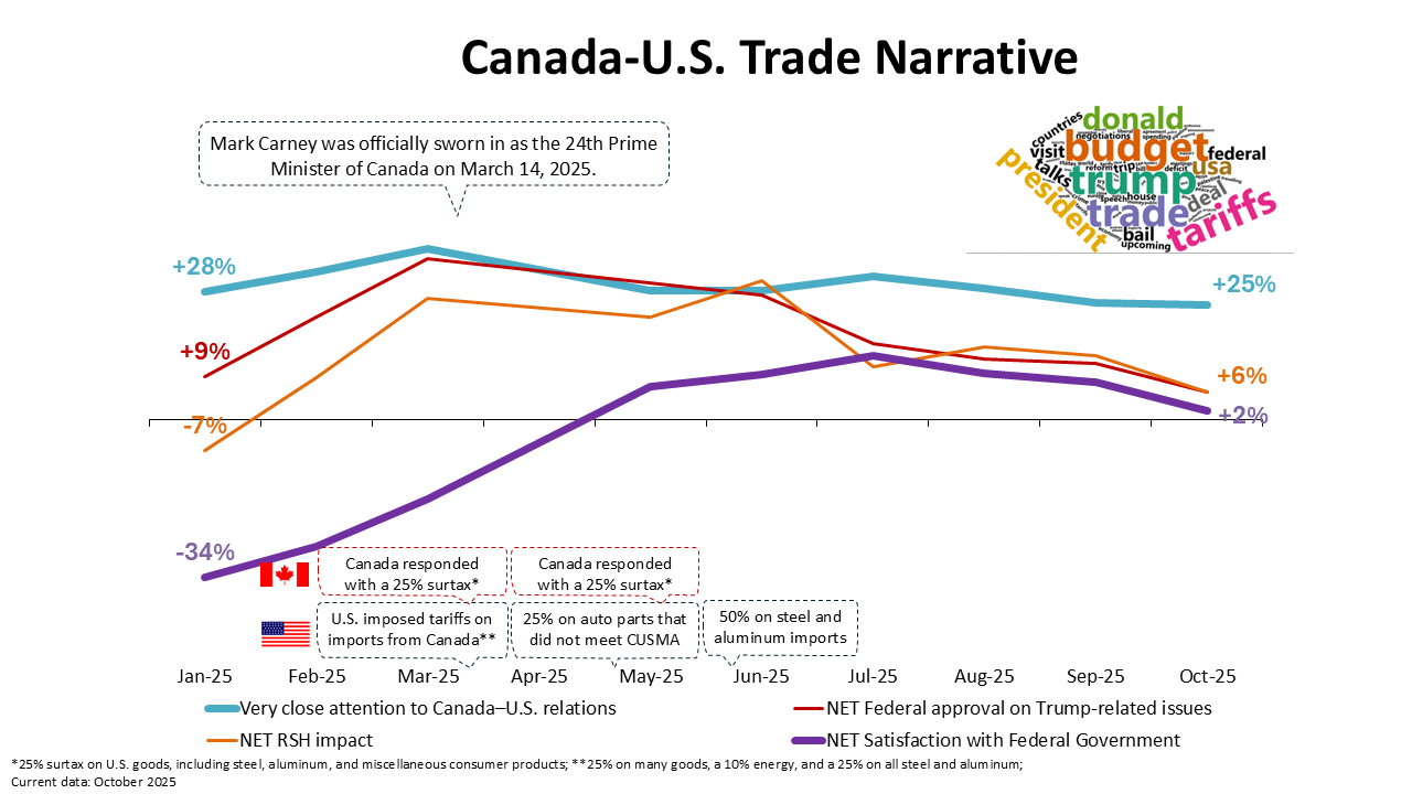 Approval of the federal government’s handling of Trump-related issues is at this year’s all-time low (33%), having returned to January’s pre-Carney levels. Net approval is at +6, 6 points lower than in September and marginally lower than in January when Trump was inaugurated and Trudeau was still Prime Minister. Notably, a larger share said “don’t know” this month (24%) than in September (8%). The generational gap in government support on this issue is striking, with those over 55 (40%) being 12 points more likely to approve of the government’s handling of Trump than those 18-34 (28%) or 35-54 (28%).
