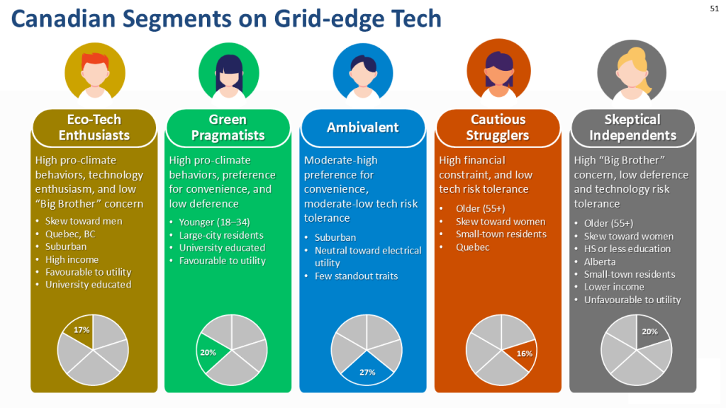 Two audience groups illustrate this divide. About one in five Canadians can be described as Skeptical Independents: they are highly concerned about giving technology control, risk-averse, and the least likely to adopt grid-edge technologies. In contrast, roughly one in six are Eco-Tech Enthusiasts: they are excited about innovation, less concerned about control, strongly motivated by climate action, and the most likely to adopt grid-edge technology.